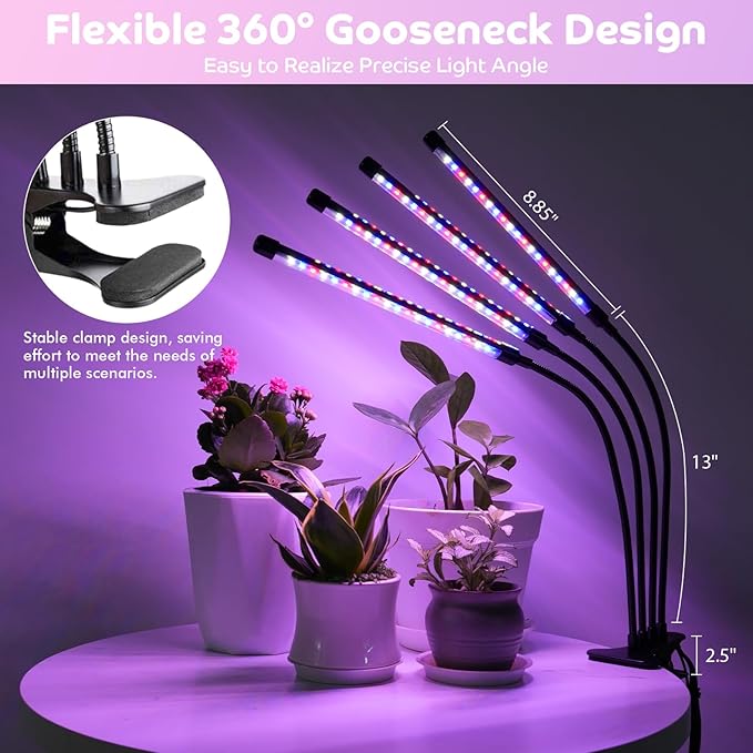 - Flexible gooseneck & sturdy clamp: Our growing lights for indoor plants with 360Β° Gooseneck and clip require less room space, you can clip it to a shelf or a desk and adjust the lights to any angle and distance