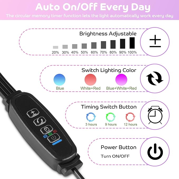 - Circular memory timing function: Our plant lights for indoor growing can automatically turn on / off for 3/9/12H every day based on your settings