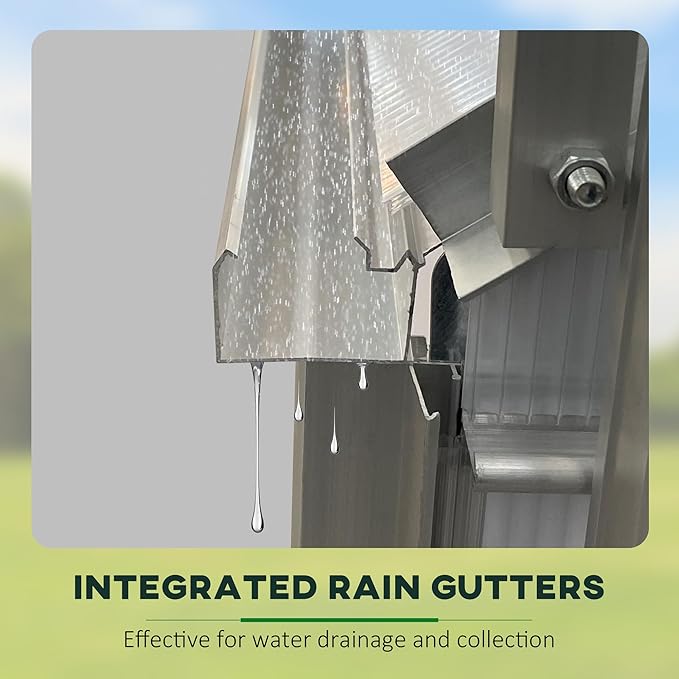 - Rooftop Vent: Keep control of heat and humidity by opening the vent found on the top of your patio greenhouse to a range of five angles. On the roof, you can also find gutters; they can collect rainwater to keep your plants hydrated.