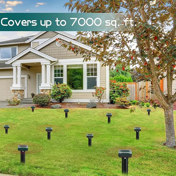 - Wide Coverage: these ultrasonic solar animal repellents cover a large area; Each mole repellent has an effective range of up to an extremely wide area; We recommend installing yard mole repellents every 45 feet throughout your lawn for optimal performance; You can push them into the ground anywhere there is sun exposure around your yard, garden, or lawn