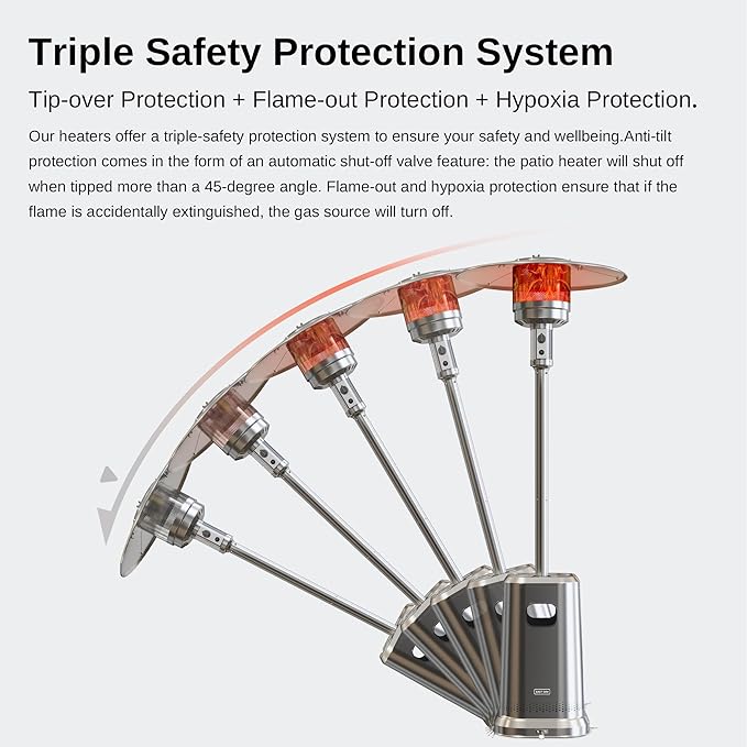 - ๐ฆ๐ฎ๐ณ๐ฒ๐๐ ๐ฃ๐ฟ๐ผ๐๐ฒ๐ฐ๐๐ถ๐ผ๐ป ๐ฆ๐๐๐๐ฒ๐บ - The tilt protection system will extinguish the flame if the propane patio heater is tilted more than 45 degrees. If the flame goes out, the flame-out protection system shuts off the gas supply