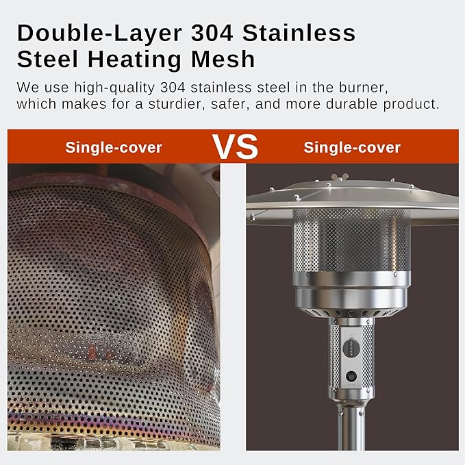 - ๐๐ผ๐๐ฏ๐น๐ฒ-๐๐ฎ๐๐ฒ๐ฟ ๐ฏ๐ฌ๐ฐ ๐ฆ๐๐ฎ๐ถ๐ป๐น๐ฒ๐๐ ๐ฆ๐๐ฒ๐ฒ๐น ๐๐๐ฟ๐ป๐ฒ๐ฟ ๐ ๐ฒ๐๐ต - High quality 430 stainless steel burning grid is used in the design of the double cover heating grid. Compared with traditional single-layer burner mesh heaters, the East Oak Patio Heaters for outdoor use are stronger, more durable, and safer, and the upgraded model's service life can be increased by 30%