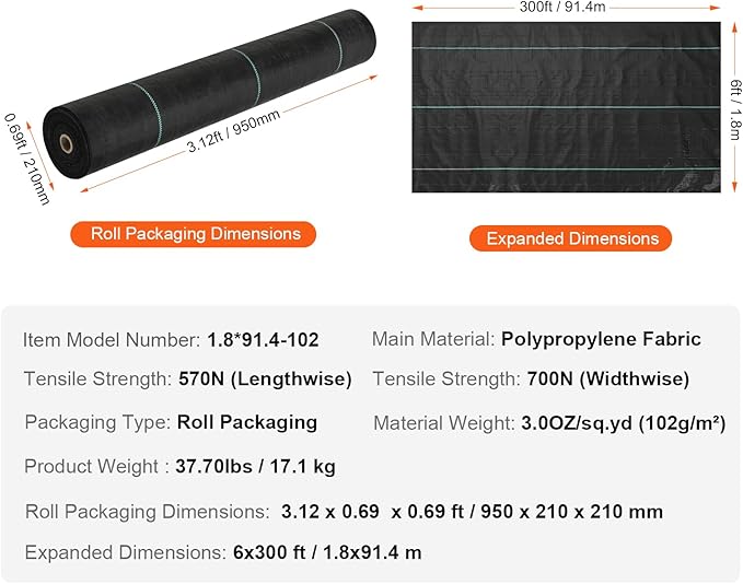 - Large Geotextile Fabric: The geotextile driveway fabric has 1800 Sq. Ft coverage area. Length: 300 ft/91.4 m. Width: 6 ft/1.8 m. According to your needs, it can be cut to function for driveway stabilization, gardening, agriculture, and drainage.