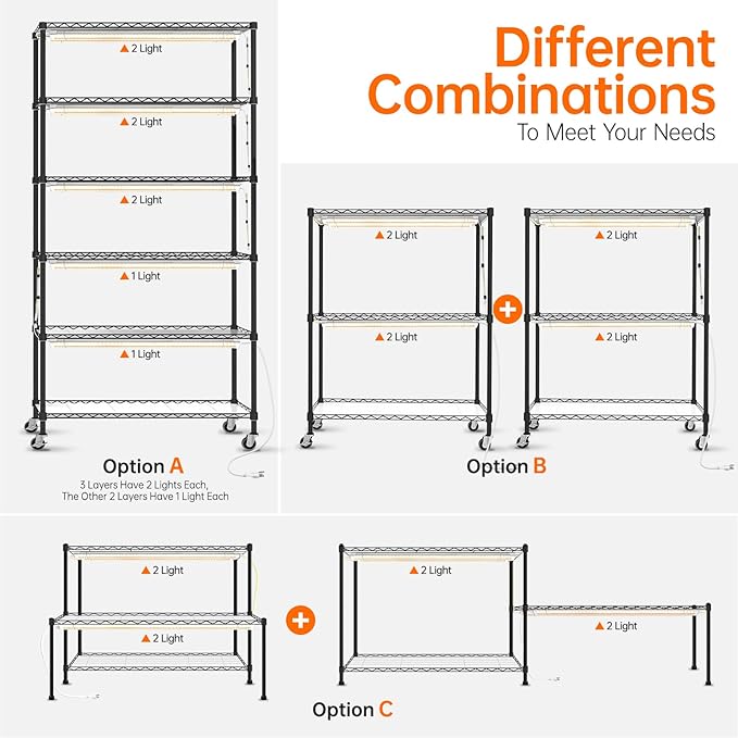 - DIY Designable Grow Light Shelf: This versatile plant shelf offers multiple installation methods, allowing you to customize it according to your specific requirements. Moreover, the height of the wire shelf is adjustable, and you can personalize the number of layers, accommodating up to six layers