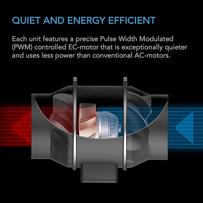 - 6-inch inline fan with PWM-controlled EC motor for quiet and energy-efficient ventilation, rated at 402 CFM airflow and 32 dBa noise.