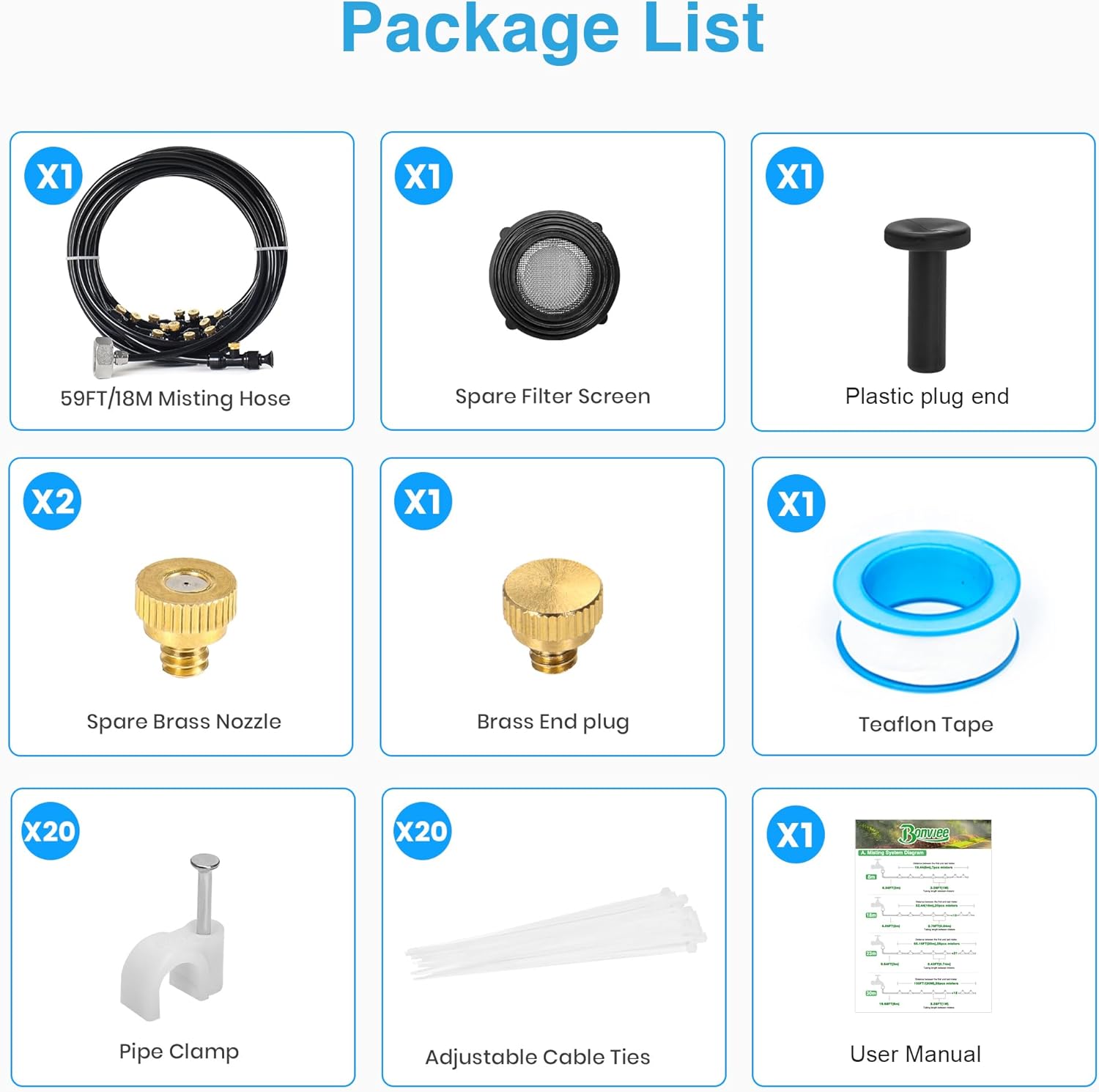 - 🌳 59FT Misting System For Medium Areas: Features 59FT (18M) tubing with 20 brass misting nozzles, perfect for medium-sized gardens, backyard dining areas, and lounging zones. Enjoy consistent and refreshing mist coverage.