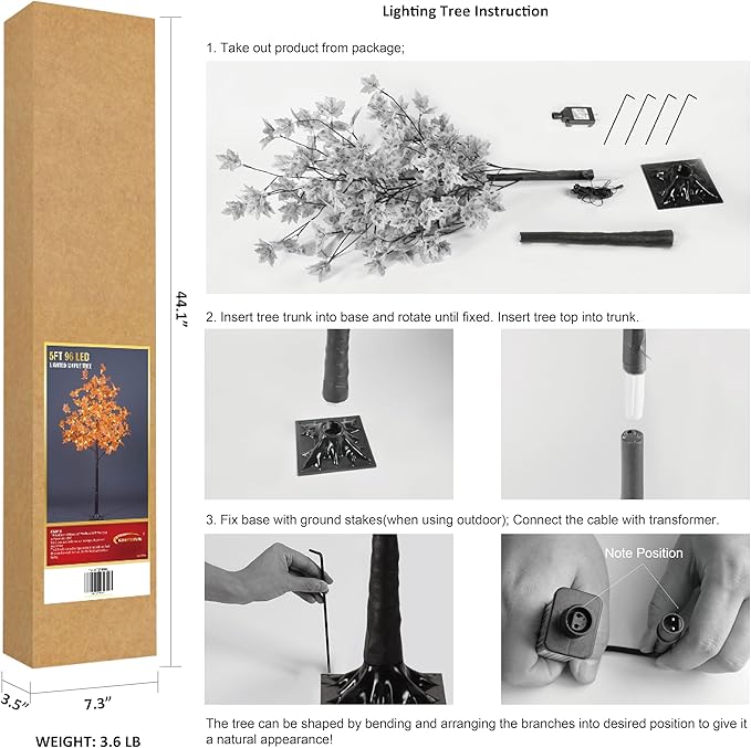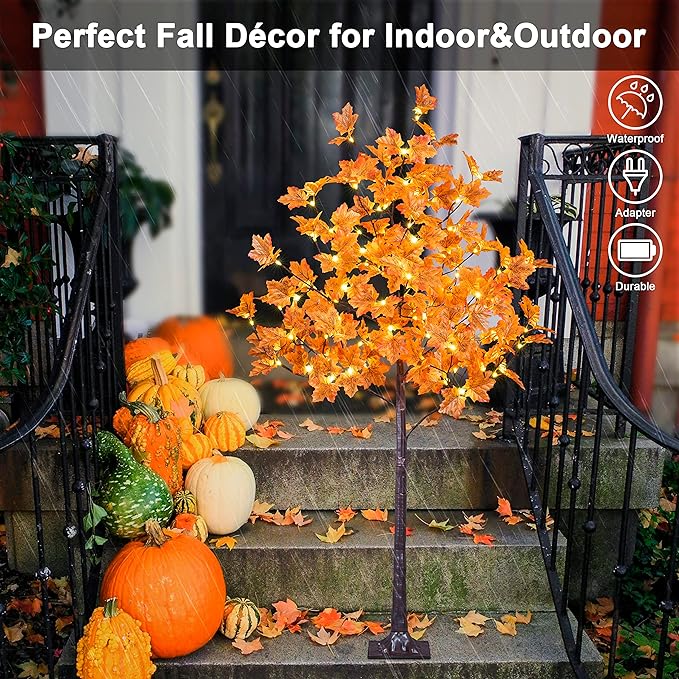 - 5FT Fall Maple Tree with 96 warm white lights, natural looking maple leaves and brown finish trunk, patent protection.