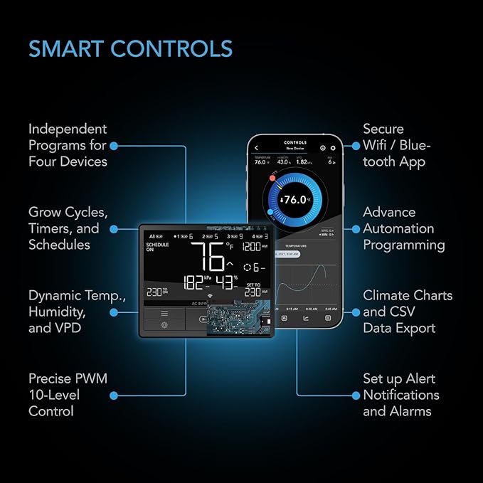 - Connect your mobile device to our app via WiFi to automate and track your grow tent climate from anywhere.