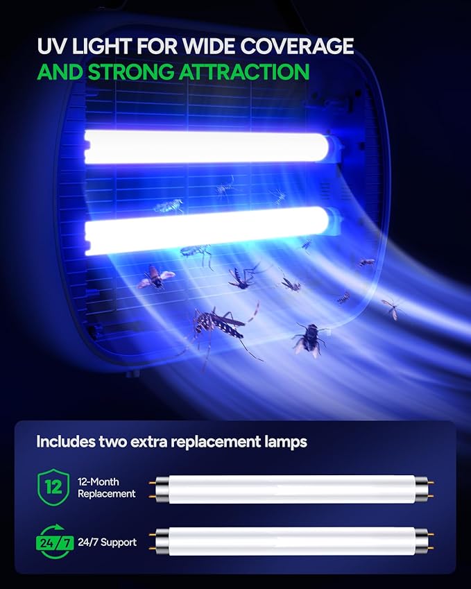 - Two Extra Lamp Tubes: The fly killer comes with two extra replacement bug zapper light bulbs included in the package. When the original lamp ages due to use, a simple replacement can allow the mosquito trap to continue to operate efficiently.