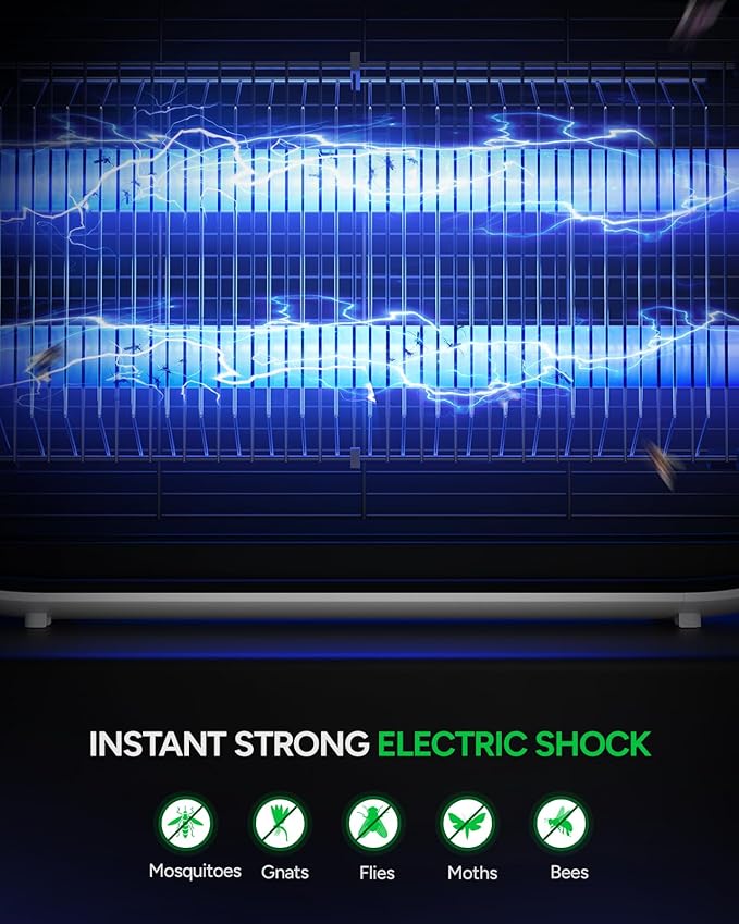 - High-Efficiency Indoor BugZapper: The 20W lamps of this bug zapper emit light to attract mosquitoes, flies, fruit flies, moths, wasps, etc. When the power grid comes into contact with flying bugs, it will release a high voltage, quickly electrocuting the attracted flying bugs to death. To get a better attraction effect, it is recommended to use the mosquito zapper at night or in a dark environment.