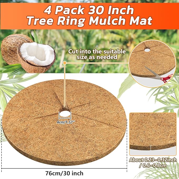 - Easy to Use and Trim: The coco mulch mat rings are 30 inches in diameter, they are lightweight and very easy to set up around the tree or plant stem, also you can trim center of coco mat to fit base of plant's & shrubs; Hope it will bring you a pleasant shopping experience and please confirm the size before buying