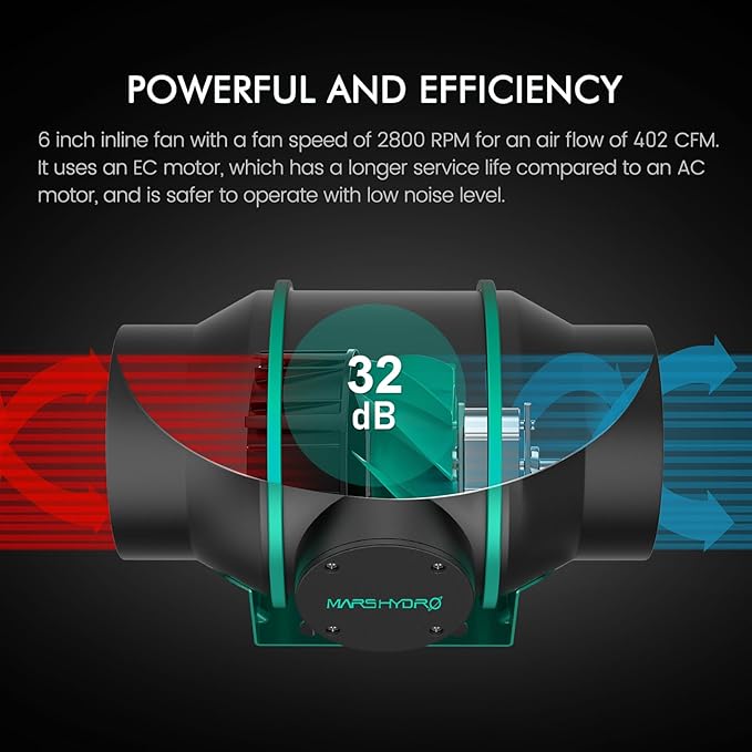 - 【402CFM Adjustable&Efficient Ventilation System】The inline fan blades have a mixed flow design to provide active air to your growing space, the fan runs at 2800 RPM,adjustable from 0 to 100%,and provides 402CFM of airflow.Only 32 dB noise.1050+ RC 48 Australian Virgin Charcoal with 25ft length flex ducting,effectively filters impurities and odors from the air.
