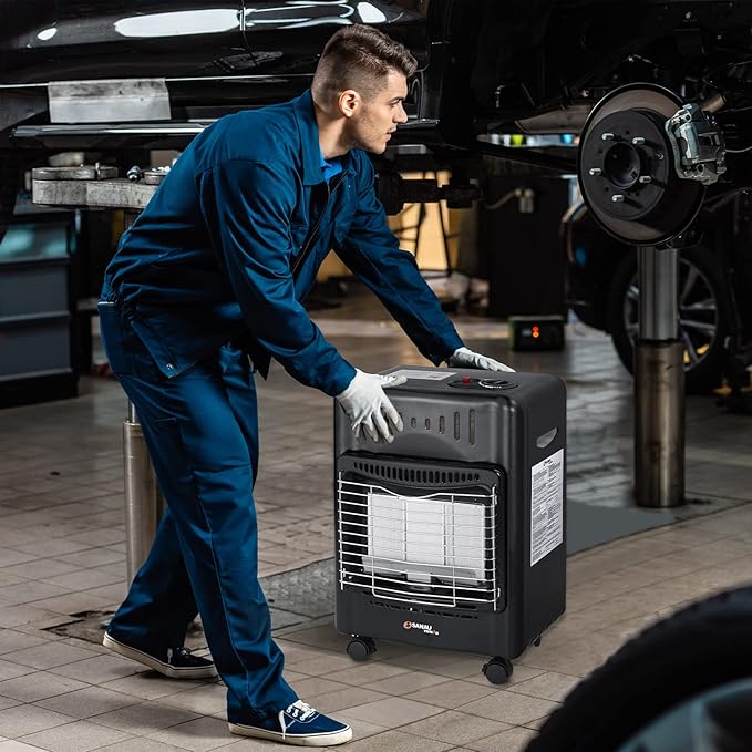 - EASY TO MOVE: The portable propane radiant heater features an easy to move design with five rotating casters at the bottom, two of which have locking features. The side handles carry the heater easily from the room to the garage.