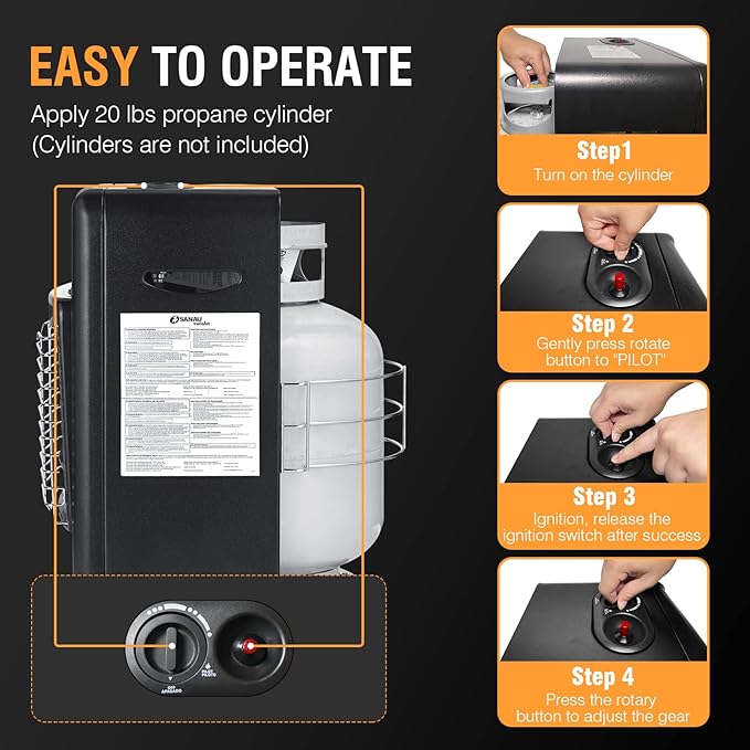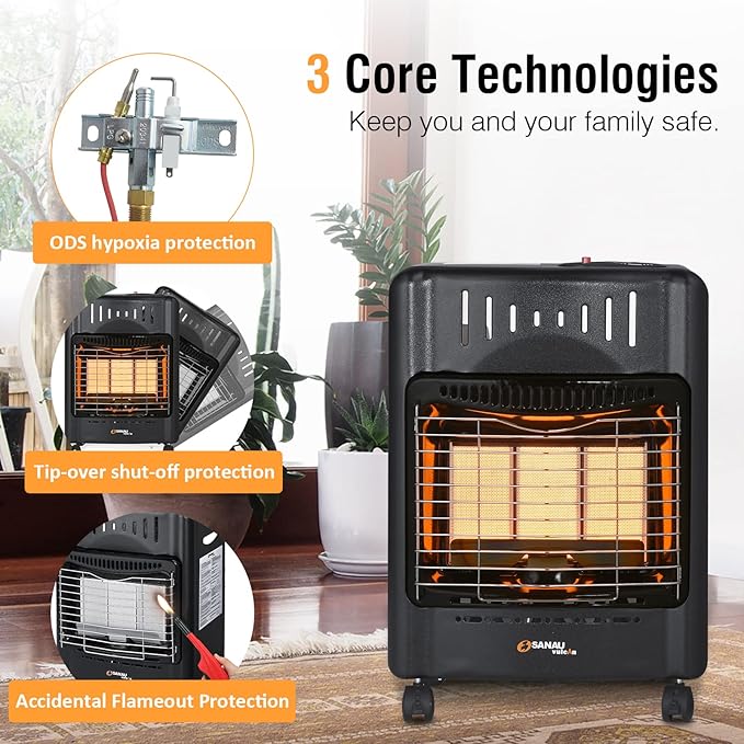 - TRIPLE PROTECTION: Our popane Cabinet Heater are equipped with dump protection, hypoxia protection, and accidental flameout protection to ensure safety. If it is accidentally knocked down or the ambient oxygen is below 18%, The heater will be turned off to cut off the gas. (It is recommended to use in a ventilated environment)