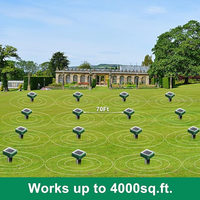 - The vibration and sonic pulses -The mole repellent emits sound waves at a frequency of 400 Hertz every 30 seconds, this sonic will effectively rid lawns, gardens, and planting beds of moles, voles, gophers, armadillos, ground squirrels, and other burrowing animals. Penetrates deep into the soil where animals burrow.