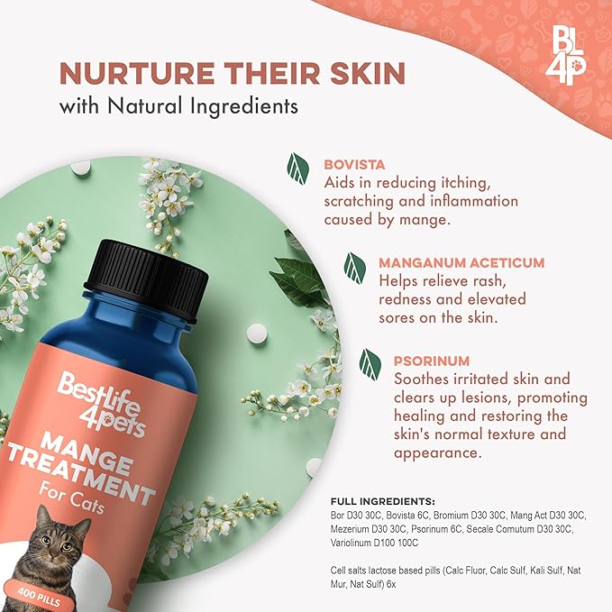 - Holistic Solution: Ideal for all cats, including kittens, this natural mange relief for cats targets the root cause of mange by getting rid of mites and helping prevent future infections. Made with select quality plants, this holistic mite killer soothes skin inflammation and calms itchiness without the side effects of traditional treatments, promoting long-term well-being for your cats.