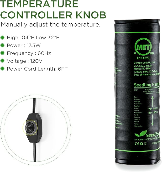 - RELIABLE RESULTS: MET safety certified;Comply with UL 499;CSA C22.2 No.64; Seedfactor’s professional heat mat is to warm a nursey tray sitting on the mat with either cuttings or seeds to get the process of rooting going on