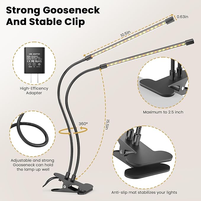 - Larger Lighting Area: 120°beam angle 2-head clip on grow light, equipped with flexible gooseneck and rotatable bulb.