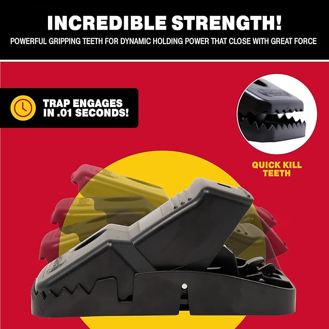 - HEAVY-DUTY: QUICK Kill: Jumbo Snapper Traps are made from heavy-duty industrial-grade plastic with a powerful mouth and gripping teeth that close with great force and instantly kill the rat. The Snapper rodent trap was designed with specific trigger sensitivity for a fast and effective snap.