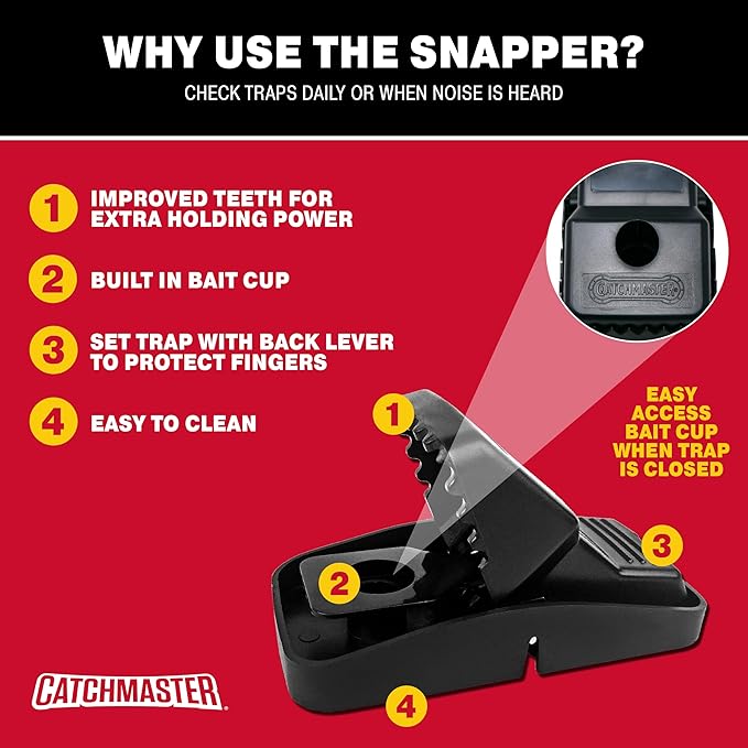 - GREAT FOR ALL APPLICATIONS: Catchmaster Jumbo Snapper Rat Traps are versatile and can be used in residential, commercial, or industrial buildings. The rat and mouse trap works both indoors and outdoors, and is great in sensitive areas where chemicals/poisons or glue traps are undesirable or prohibited.