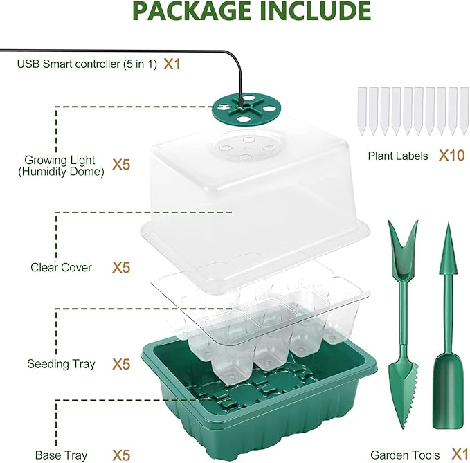 - 【Value Package】A complete seed starter kit includes - 5 x Seed Trays (12 Cells per Tray), 5 x Humidity Dome, 5 x Plant Grow Lights(8 LEDs per light), 1 x Smart control system(73" control line), 5 x Watertight Base Tray, 10 x Plastic Plant Labels, 2 x Plant Tools. Perfect for seed starting, seed germination, seedling starting, succulent cuttings or other plant clone propagation.