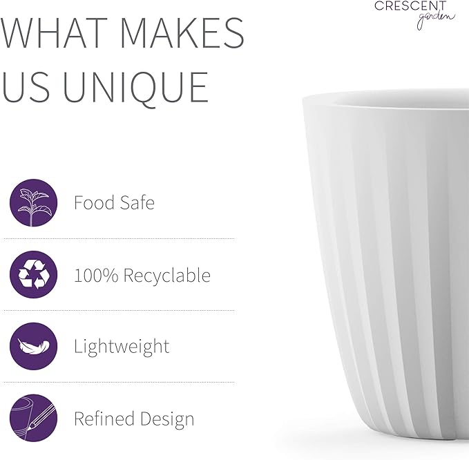 - RECYCLABLE: Crescent Garden's eco-friendly planters are made from 100% recyclable high-grade polyethylene. Being lightweight makes them easy to place anywhere indoors or outdoors but also means we use less packaging and energy for transportation.