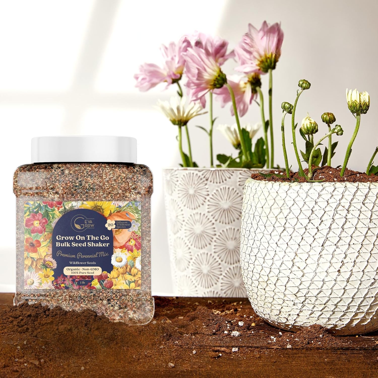 Bulk Wildflower Seed Shaker – Perennial Flower Seeds Mix to Plant Anywhere, by Geva Grow | 20 - Different Type Beautiful Perennial Wildflower Seeds Bulk 900,000+ Seeds, 1 Pound Tub