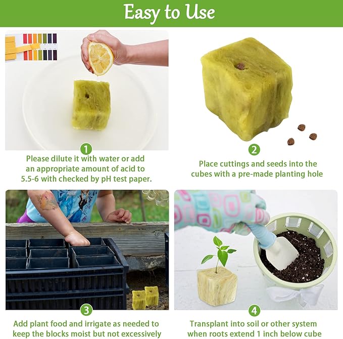 - Easy to Use: Please use the knife to cut the rock wool into small cubes; Soak it briefly in diluted nutrient solution (10 seconds) or add citric acid to adjust the pH value to approximately 5.5, which is preferred by most plants; Place the seeds into the pre-set holes, control the proper moisture, temperature, light, and wait for the roots to grow 0.5-1 inch, then move the cubes directly into the soil or hydroponic system