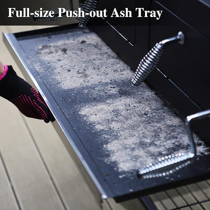 - ๐๐๐ฌ๐ฒ ๐ญ๐จ ๐๐ฅ๐๐๐ง: This heavy duty extra large bbq charcoal grill has individual dual doors with cool-touch metal handle on the front cover where you can add fuel (or re-arrange the hot coals) while cooking without having to move the food or remove the grills. Full-size push out ash pan is removable for quick and easy clean-up ashes