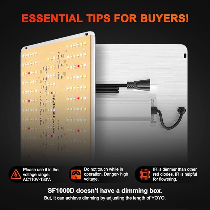 - SAMSUNG LM301B Diodes: 2025 New Version SF1000D LED grow light uses premium Samsung LM301B diodes and LED plant light technology, delivers powerful light output and uniform canopy penetration, lights can be absorbed better by plants. Veg footprint is 3 x 3 ft, Flowering footprint is 2 x 2 ft.