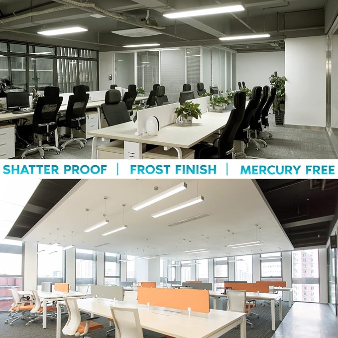 - High Brightness & Efficiency – Each 4-foot LED tube produces 3000 lumens of crisp, high-quality light with an efficiency of 125 lm/W, providing superior illumination compared to standard 48-inch fluorescent tubes. Ideal for offices, garages, workshops, basements, and commercial spaces.