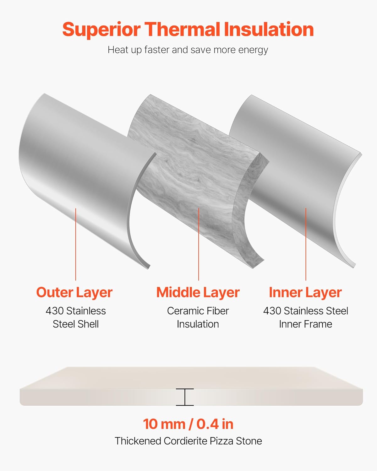 - Durable Construction: This pizza oven withstands outdoor conditions and frequent use. Adopted a 3-layer construction, promoting efficient heat circulation. Featuring a 430 stainless steel shell, and thick insulation cotton, it ensures durability and excellent heat retention