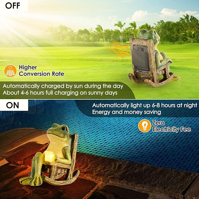 - SAFE SOLAR POWERED LIGHT - Brighten up an entryway or bedroom with these charming handmade coffee loving frog statue decor that are also great conversation pieces. Simply place it at a location with direct sunlight during the day, the solar panel will charge within 4-6 hours during the day and light up automatically at night for 6-8 hours. This is good for the environment and your wallet.