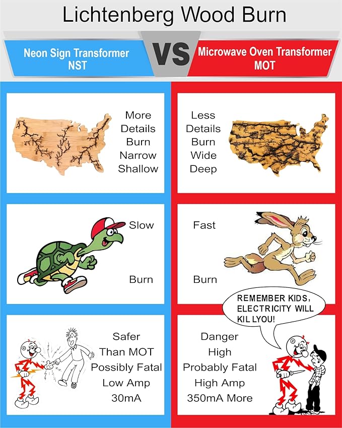 - Neon light sign power supply is safe for making lichtenberg fractal wood burning figures due to lower amperage.