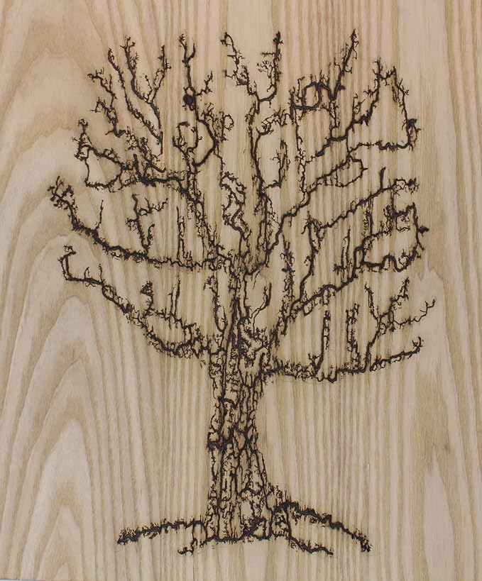 - Neon sign transformer burns more lichtenberg tree details, easily control burning than microwave oven transformer due to high voltage and lower amperage.