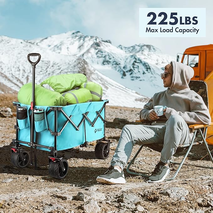 VILLEY Collapsible Folding Wagon with Big Wheels, All Terrain Beach Wagon Cart Heavy Duty Foldable, Enlarged 225lbs Capacity, Portable Utility Garden Cart with 2 Cup Holders and Brake, Blue
