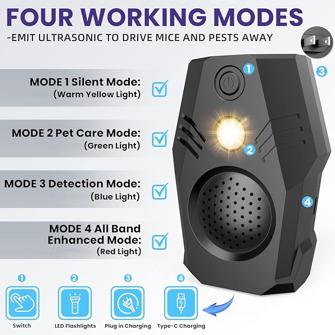 - MULTI FUNCTIONS: The rat repellent with 4 modes can meet all your needs. Different light colors represent different functions, and you can choose the appropriate mode to use according to the environment. For example, you can choose silent mode in the bedroom. Using the rodent repellent to repel critters is a humane pest control solution.