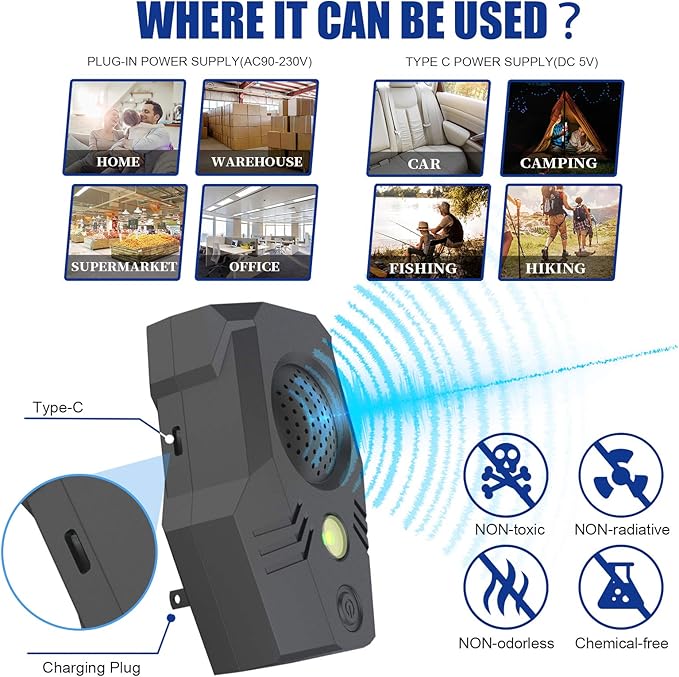 - SAFE PEST CONTROL: This new device uses environmentally friendly frequency conversion ultrasonic waves to interfere with the central nervous system, taste, hearing and visual nervous systems of pests. Without killing critter and no poison, no more need to prepare various mouse poison, mouse traps, mouse mats, rat glue traps, roach motels, cockroach bait, rat poison, raccoon blocker and insect sprays. Get rid of annoying insects.