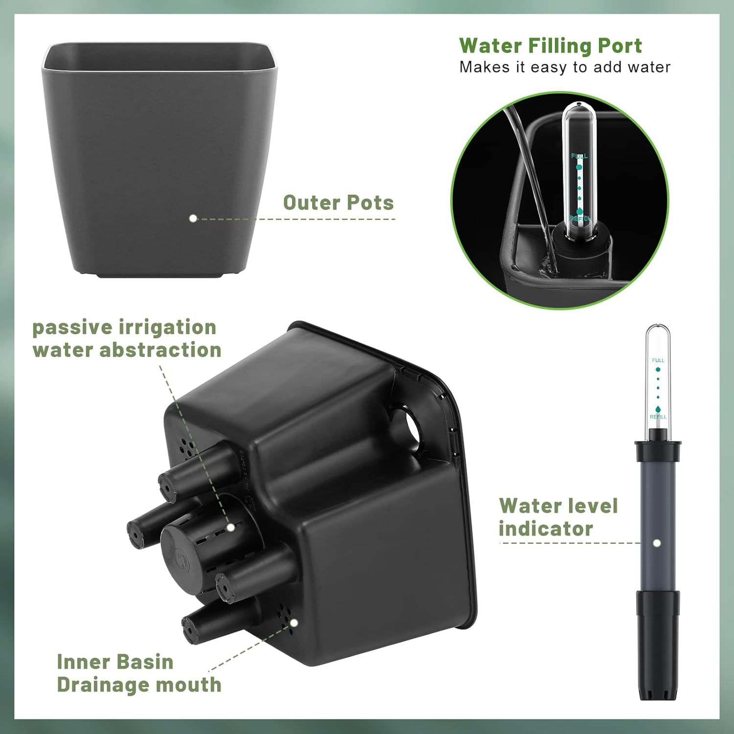 - 5.2 inch Square Plastic self watering Flower Planters the outer pot is used to store water while the inner pot is used to place plants and soil. The special water inlet can keep the surface of the soil dry all the time. It won’t rot the soil to create odor and attract insects.
