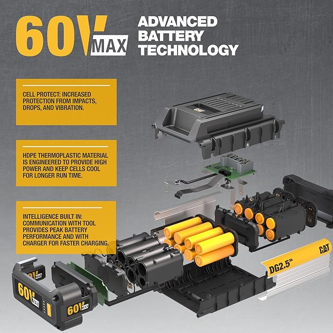 - CORDLESS LAWN MOWER WITH BATTERY AND CHARGER INCLUDED: Included Cat 60V battery and charger is compatible with all Cat 60V OPE products. Cat 60V batteries are engineered to resist damage and heat stress to optimize power, runtime, and cell life