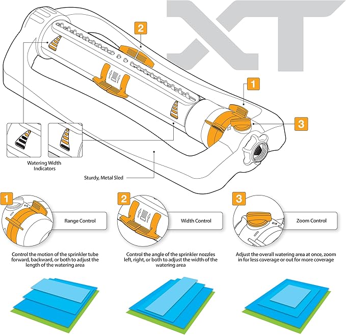 - Zoom Control adjusts the overall watering area. Zoom in for a small patch of newly seeded lawn or all the way out to cover a large section of the yard.
