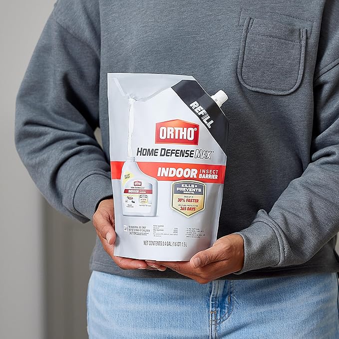 - This easy-to-use 1.5 L pouch of Ortho Home Defense Max Indoor Insect Barrier refills your designated ready-to-use container with battery-powered sprayer