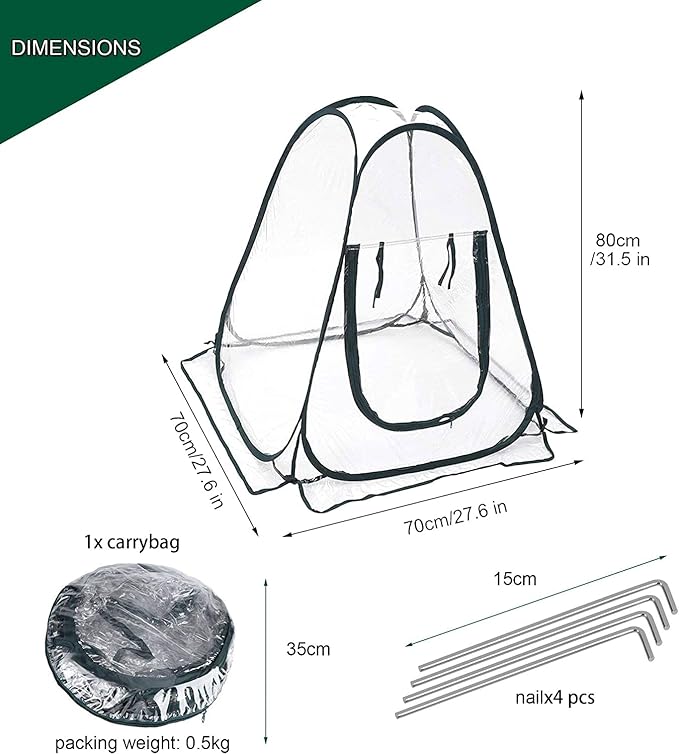 - Greenhouse Size: 27.6"x27."6x31.5" Package size:13.7"*13.7"*5" Package weight: 3.0KG Material: UV50+ PVC cover, steel hoops.