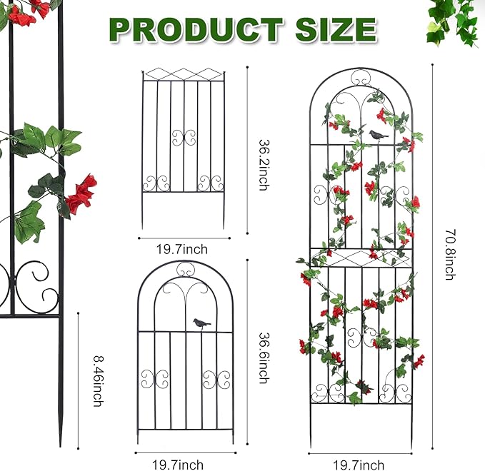- 【Easy To Assemble】 The trellis for climbing plants is easy and quick to assemble. Insert the ground spike into the ground, and then fix this plant stand near the wall, flower pot or fence. Unit dimension: 2 pack, 70.8" high x 19.7" wide. Note: Vines shown are not included.