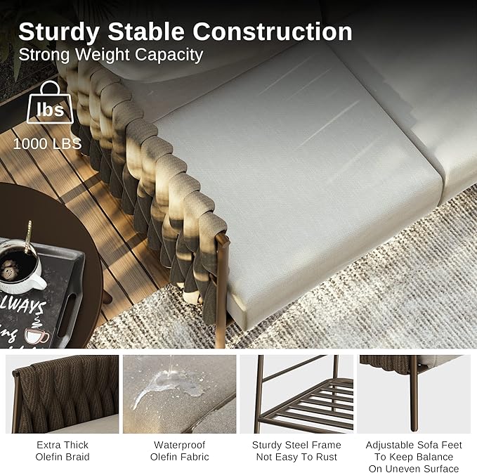 - PREMIUM MATERLIAL FOR LASTING USE: Our patio sofa is braided from delicate Olefin wide rope and has a strong visual sense and good comfort.