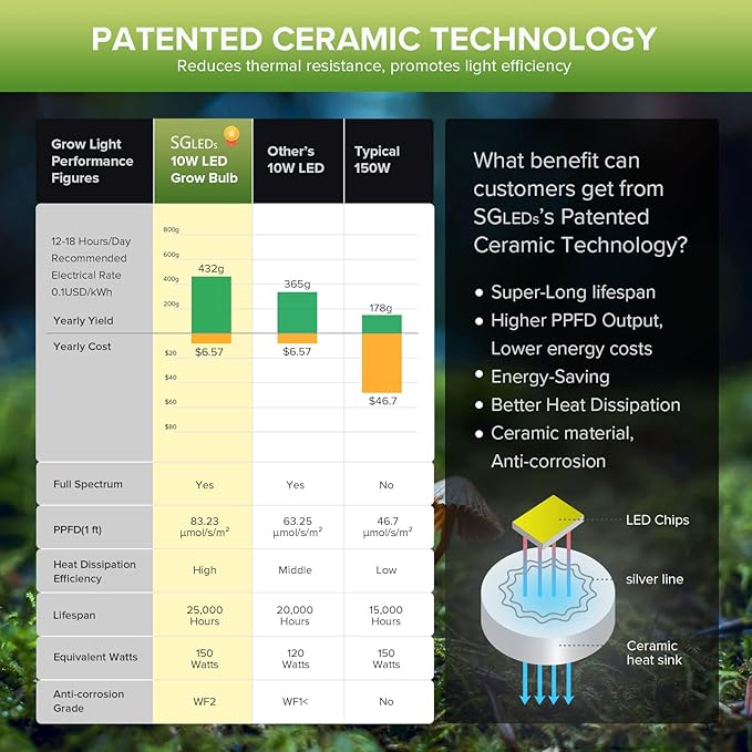 Grow Light Bulb 10 Watt with Ceramic Technology PPF 17.5 umol/s LED Full Spectrum Grow Lamp with High PPFD, Energy Saving Plant Lights for Seeding Growing
