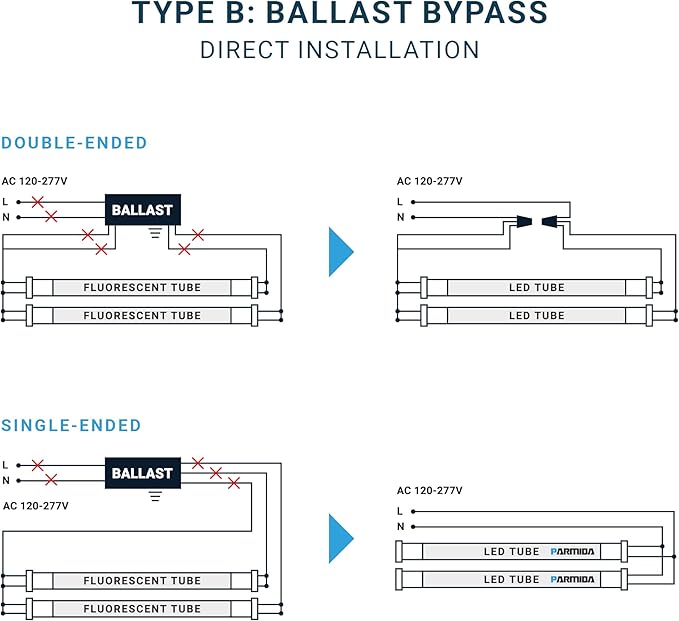 - BALLAST BYPASS. These tubes must be installed using the ballast bypass method. Use the instructions provided to remove the ballast from your fixtures and directly wire your new T8 tubes.