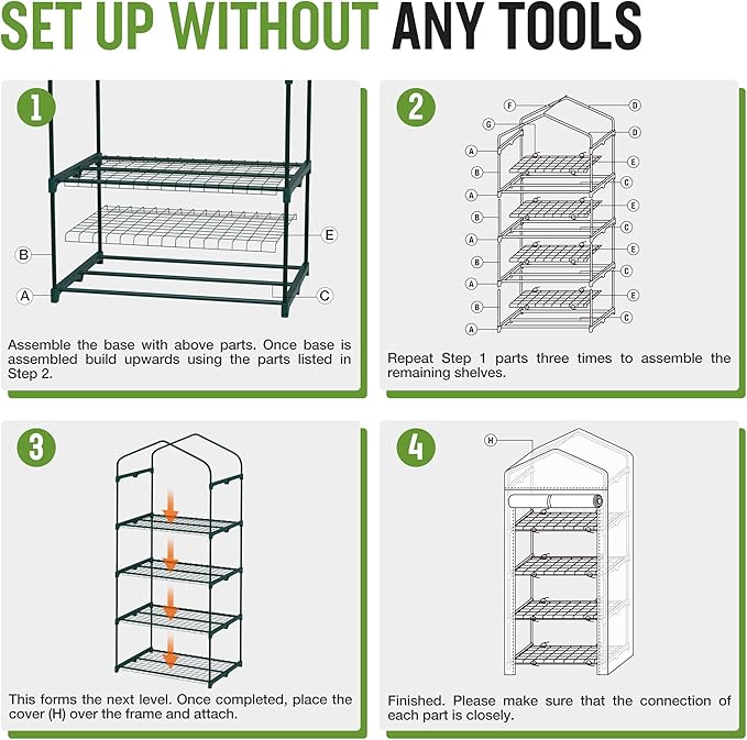 - Tool-Free Setup & Compact Storage: No tools required! This garden 4 tier greenhouse is designed for quick and easy assembly. Lightweight yet sturdy, it’s easy to move around and can be disassembled and folded for space-saving storage when not in use