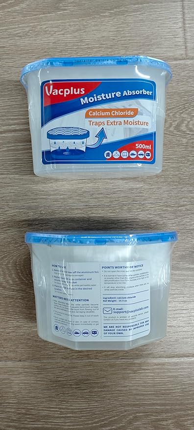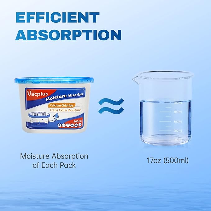 - Efficient Dehumidification: The 6.1 x 3.3 x 4.1 inches Vacplus moisture absorber uses spherical calcium chloride to enlarge the absorbing area and traps excess moisture quickly. The large collecting capacity of this moisture remover keeps a long time dry.