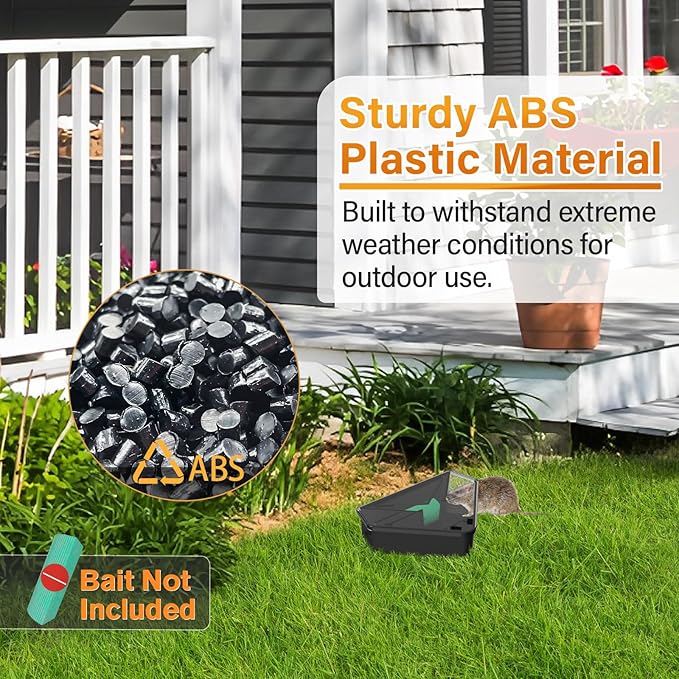 - 【Stealth Design & Weatherproof】The weatherproof, refillable Mice box is perfect for indoor and outdoor use. This mouse box is a perfect size (5" L, 3.5" W, 1.25" H) for inside-outside placement, corners, etc.. Small footprint, low-key and harmonious black make this mouse station can be perfectly integrated with your indoor and outdoor places.